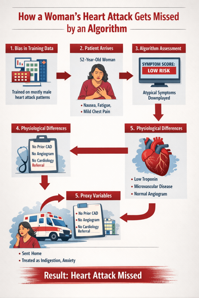 If diagnostic thresholds were calibrated primarily from male data, the model may interpret the lab result as low probability of infarction.