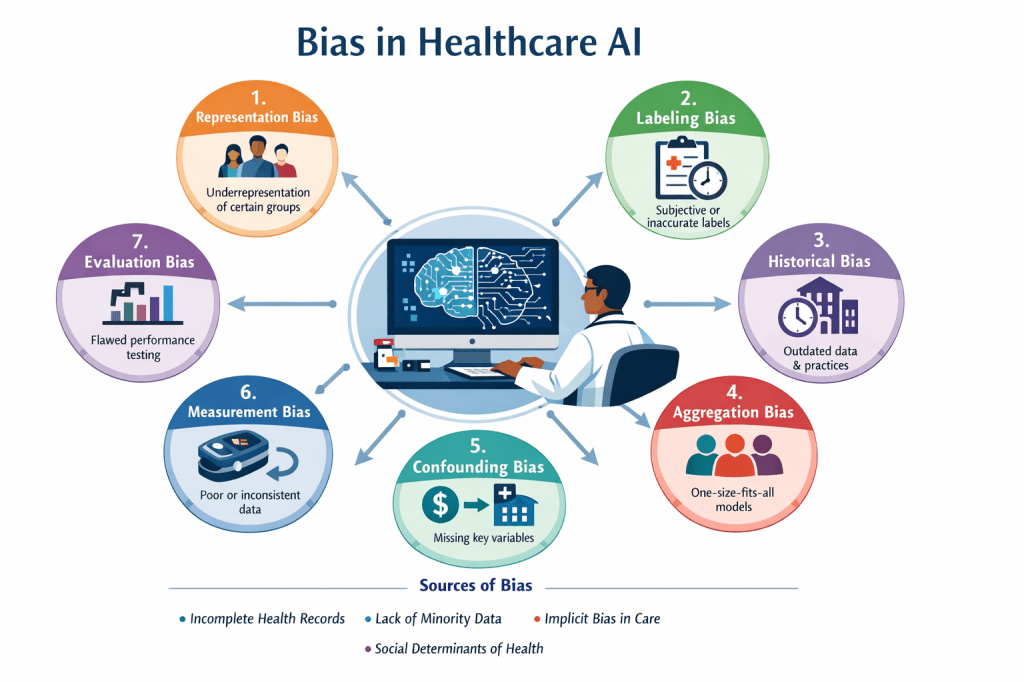 Bias in healthcare AI often enters during the stages of data collection, labeling, model development, and evaluation. Understanding these forms of bias is essential for building systems that perform reliably across patient populations.